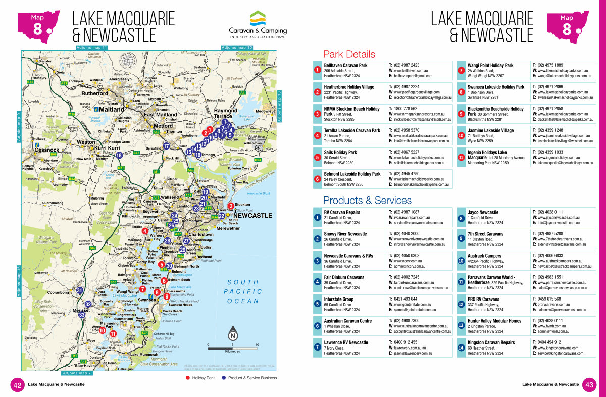 ROAD WYEE ROAD LAKE DRIVE LEGGETTS DRIVE COUNTRY WINE DRIVE RENSHAW JOHN DRIVE BOOTH GEORGE ROAD WANGI DRIV E FREEMANS ROAD HUE HUE ROAD MAIN ROAD TOCAL ROAD SEAHAM ROAD BAY N ELSON ROAD RICHARDSON ROAD MEDOWIE ROAD TOWN CLARENCE H W Y PACIFIC HWY ENGLAND NEW HWY PACIFIC EXPRESSWAY HUNTER MWY PACIFIC MWY PACIFIC A1 M1 M1 M15 A43 A43 A37 A15 A15 A37 B63 B53 B89 B89 A43 A43 A43 A43 B57 M15 B82 B82 B82 A43 B68 B68 B63 The Caves Hunter Wetlands National Park Jilliby State Conservation Area Munmorah State Conservation Area Sugarloaf State Conservation Area Tilligerry State Conservation Area Wallaroo National Park Watagans National Park Werakata National Park Worimi Regional Park Werakata National Park Newcastle Bight SOU T H P ACI F I C OCEAN Lake Macquarie Belmont Lagoon Wentworth Smamps Lake Munmorah Lake Macquarie Colliery Dam Grahamstown Lake Duckenfield Butterwick Keinbah Hexham Catherine Hill Bay Leconfield Elrington Oakhampton Luskintyre Freemans Waterhole Wakefield Buchanan Osterley Kingfisher Shores Twelve Mile Creek Maitland Vale Oakhampton Heights Campvale Eraring Mandalong Woodville Doyalson Kitchener Millers Forest Eagleton Mount Vincent Bishops Bridge Awaba East Seaham Brunkerville Lovedale Hinton Glen Oak Martinsville Sawyers Gully Sandgate Dooralong Seahampton Doyalson North Nelsons Plains Neath Farley Silverwater Sunshine Horseshoe Bend Williamtown Kearsley Louth Park Minmi Abernethy Brandy Hill Mulbring Marmong Point Murrays Beach Bolwarra Cliftleigh Swansea Heads Nulkaba Black Hill North Rothbury Carey Bay Heatherbrae Lochinvar Quorrobolong Windella Fullerton Cove Nords Wharf Bellbird Heights Killingworth Windermere Park Stanford Merthyr Pelican Brightwaters Balcolyn Balmoral Croudace Bay Tomago Blacksmiths Ashtonfield Lambton Broadmeadow Tarro Arcadia Vale Caves Beach Mt Hutton Mannering Park Blackalls Park Wallalong Heddon Greta Gillieston Heights Wyee Point Raworth Argenton Beresfield Dudley Bar Beach Fennell Bay Speers Point Branxton Teralba Belmont South Wangi Wangi Lorn Pelaw Main Tenambit Telarah Coal Point Jewells Chain Valley Bay Shortland Rathmines Kilaben Bay Bonnells Bay Glendale Woodberry Bolwarra Heights Marks Point Summerland Point Wyee West Wallsend Aberdare Seaham Wickham Whitebridge Dora Creek Gateshead Fern Bay Stockton Warabrook Morpeth The Hill Kahibah Halekulani Chisholm Redhead Fishing Point Holmesville Greta Abermain San Remo Morisset Barnsley Largs Callaghan Bolton Point Gwandalan Waratah Boolaroo Bennetts Green Medowie Belmont North Belmont Lake Munmorah Cooranbong Cardiff Valentine Toronto Edgeworth Thornton Swansea Eleebana Adamstown Mayfield Maryland Warners Bay Fletcher Aberglasslyn Elermore Vale Cameron Park Blue Haven Charlestown Weston Kurri Kurri Metford Cessnock Merewether Wallsend Raymond Terrace East Maitland Rutherford Maitland NEWCASTLE River Hunter River Hunter Stony Point Redhead Point Blacksmiths Point Reids Mistake Head Flat Rocks Point Bongon Head Quarries Head Hales Bluff RAAF Base Williamtown Newcastle Airport Mt Torrance Wallaroo Mountain Mt Seaham Mt Nellinda Mt Myall Mt Kanwary Davrons Mountain Summit Point The Monkey Mount Sugarloaf Kilometres 0 5 10 3 4 5 6 8 7 9 10 3 1 22 23 19 20 21 28 27 29 30 2 33 31 24 25 32 26 6 17 18 Produced for the Caravan & Camping Industry Association NSW. Base map and data © Custom Mapping Services 2021 Morisset 11 8 9 10 11 13 12 14 16 15 4 5 7 1 2 Adjoins map 10 Adjoins map 7 Adjoins map 9 Adjoins map 16 Adjoins map 11 Adjoins map 10 Holiday Park Product & Service Business Lake Macquarie & Newcastle Map 8 Bermagui Fishermans Wharf, Bermagui Courtesy Destiantion NSW 42 Lake Macquarie & Newcastle 42