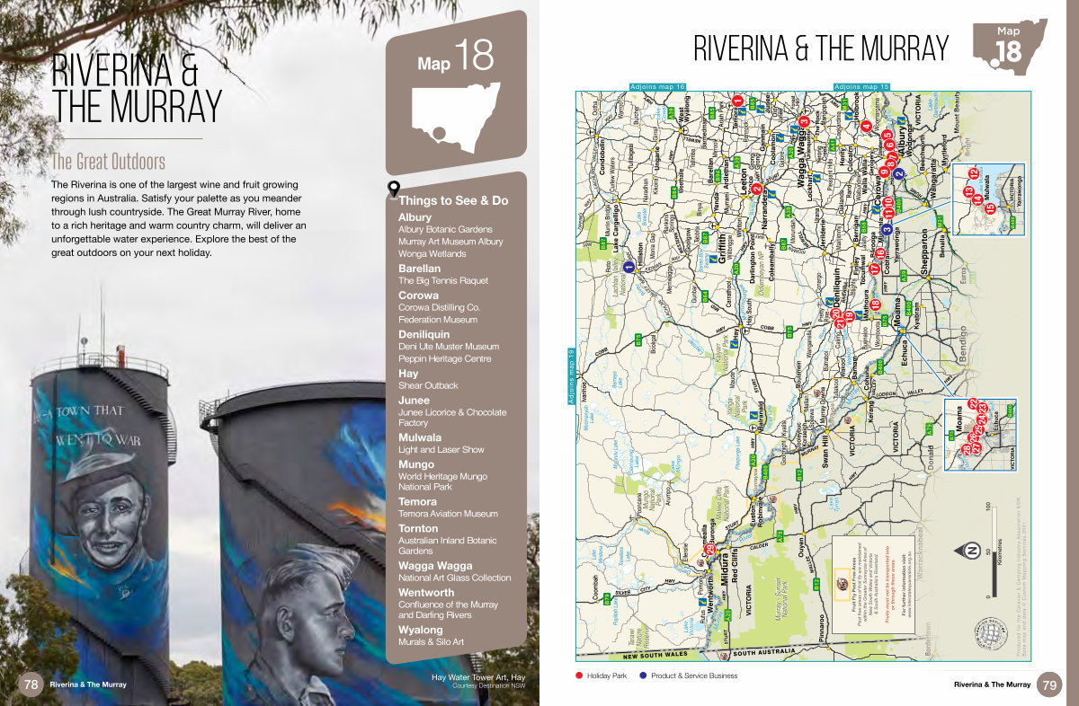 Map 18 Riverina & The Murray A66 A8 B12 B12 M31 M31 M31 B79 B75 B75 B75 B87 B87 B87 A39 A39 A39 A39 A39 A20 A20 A20 A20 A20 B58 B64 B64 B85 B85 B94 A41 A79 A79 B400 B400 B400 B400 Wyperfeld National Park Murray- Sunset National Park Lake Cowal Garnpung Lake Lake Tyrrell Lake Victoria Lake Dartmouth Lake Eppalock Lake Lonsdale Lake Hindmarsh Lake Mungo Moornanyah Lake Popiltah Lake Pitarpunga Lake Barneys Lake Mulurulu Lake Lake Mindona Travellers Lake Lake Brewster Barren Box Swamp Yanga Lake Lake Hume Curlew Waters Rufus Morundah Mallan Tabbita Burcher Naradhan Girral Goodnight Ootha Tullakool Mirrool Murrin Bridge Mairjimmy Burraboi Pretty Pine Wanganella Maude Calimo Speewa Galore Bunnaloo Willbriggie Bedgerabong Ellerslie Rankins Springs Merriwagga Womboota Blighty Pooncarie Pomona Binya Conargo Warroo Tallimba Rannock Lalalty Kyalite Wantabadgery Illabo Booligal Roto Kikoira Monia Gap Gunbar Cookardinia Pleasant Hills Walbundrie Woomargama Arumpo Oaklands Wakool Tullibigeal Koraleigh Goolgowi Mangoplah Ivanhoe Carrathool Coombah Murrami Tooleybuc Murray Downs Rand Hay South Urana Moulamein Tarcutta Barmedman Old Junee Whitton Grong Grong Ariah Park Weethalle Yerong Creek Mathoura Ungarie Walla Walla Euston Trundle Ganmain Coomealla Ardlethan Barellan Gerogery Uranquinty Yanco Pinnaroo Lake Cargelligo Barooga Coolamon Balranald Wentworth The Rock Lockhart Mulwala Henty Tocumwal Barham Coleambally Forest Hill Jerilderie Holbrook Condobolin Hay Hillston West Wyalong Culcairn Darlington Point Temora Howlong Jindera Buronga Berrigan Yenda Junee Narrandera Moama Leeton Deniliquin Corowa Red Cliffs Bordertown Nhill Warracknabeal Donald Bright Dimboola Ouyen Mount Beauty Beechworth St Arnaud Robinvale Kerang Euroa Mansfield Cohuna Myrtleford Stawell Naracoorte Seymour Renmark Cobram Kyabram Castlemaine Yarrawonga Maryborough Griffith Albury Wagga Wagga Mildura Shepparton Wangaratta Echuca Horsham Benalla Swan Hill Wodonga Bendigo Victoria NEW SOUTH WALES SOUTH AUSTRALIA VICTORIA VICTORIA VICTORIA VICTORIA Kilometres 0 50 100 VICTORIA B400 B75 River Murray Moama Echuca B400 Lake Mulwala Mulwala Yarrawonga VICTORIA River Murrumbidgee River Wakool River Murray River Murray River Lachlan River Darling Kalyarr National Park Lachlan Valley National Park Mallee Cliffs National Park Mungo National Park Oolambeyan NP Tarawi Nature Reserve Yanga National Park WAY KIDMAN WAY TIPPING WAY KIDMAN WAY VALLEY LACHLAN WAY VALLEY LACHLAN WAY KIDMAN HWY RIVERINA HWY WESTERN MID HWY COBB HWY HUME HWY STURT HWY COBB HWY NEWELL HWY STURT HWY NEWELL HWY CITY SILVER HWY STURT HWY STURT HWY CALDER HWY HUME HWY MURRAY VALLEY HWY MALLEE HWY LODDON VALLEY River Edward Fruit Fly Pest Free Areas Pest free areas of fruit fly are maintained within the Greater Sunraysia Area of New South Wales and Victoria & South Australia’ s Riverland. Fruits must not be transported into or through these areas. For further information visit: www. interstatequarantine. org. au Sunraysia Sunraysia Finley 2 1 3 4 11 10 16 12 13 14 15 17 18 22 27 26 28 23 29 25 24 20 19 21 5 6 7 8 9 1 2 3 Produced for the Caravan & Camping Industry Association NSW. Base map and data © Custom Mapping Services 2021 Deniliquin Adjoins map 15 Adjoins map 19 Adjoins map 16 Holiday Park Product & Service Business 79 Riverina & The Murray 79